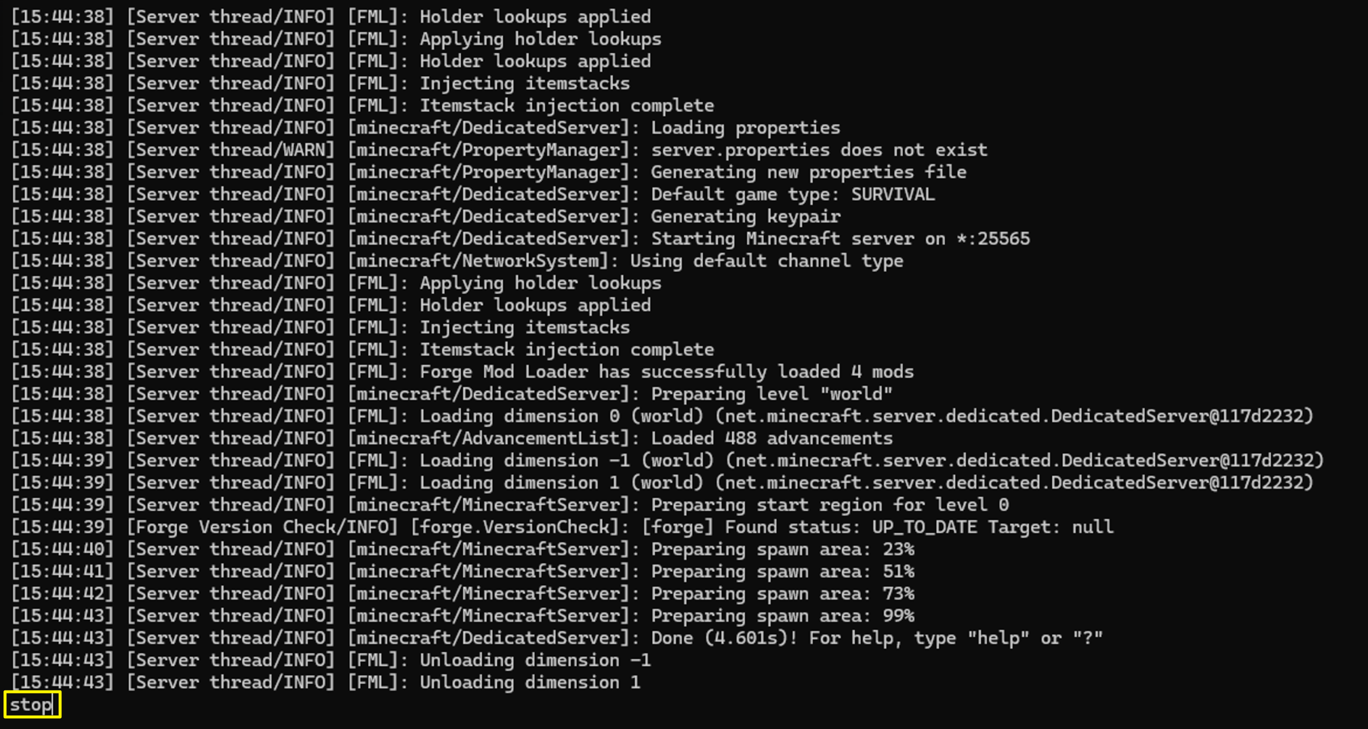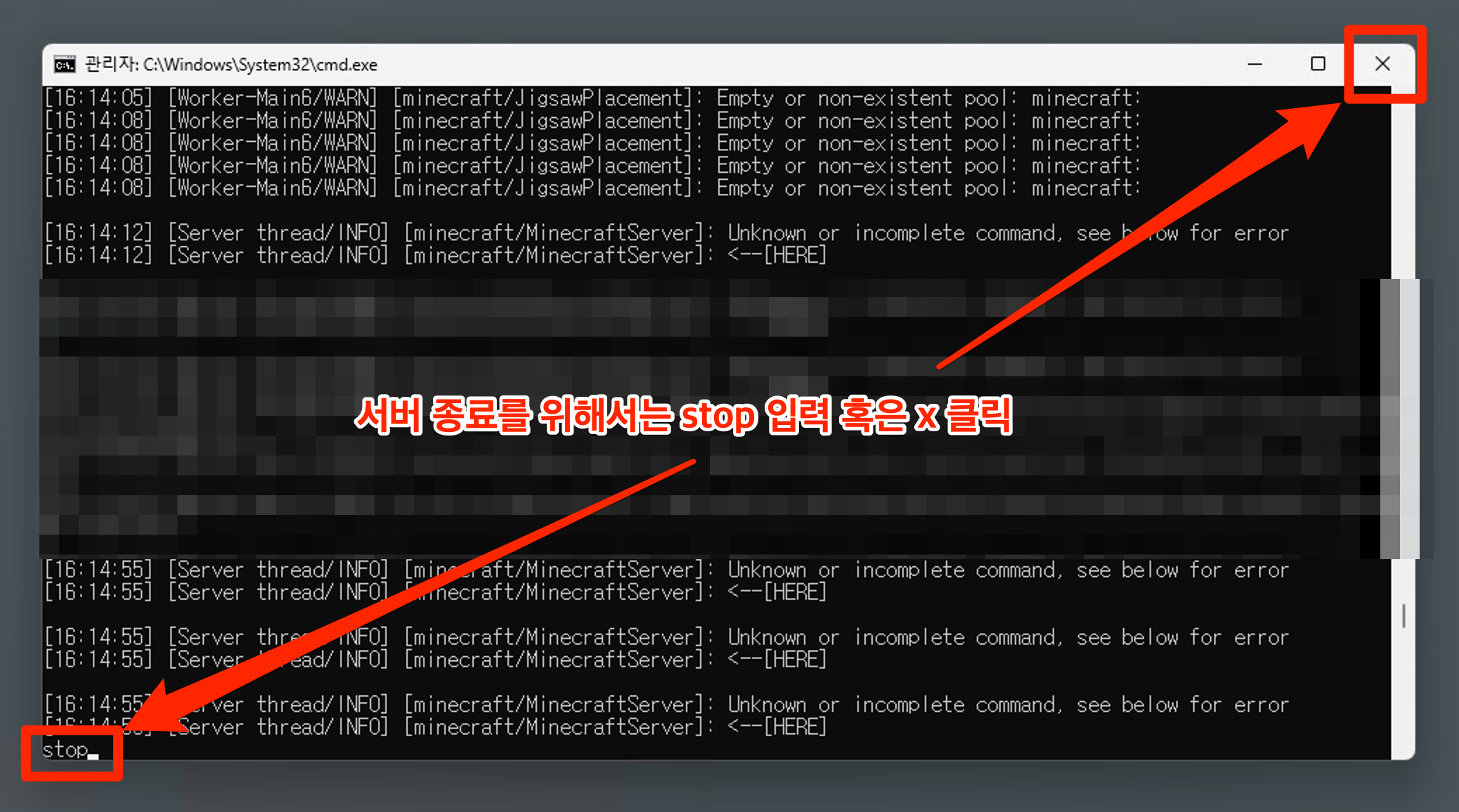 서버를 종료하고 싶다면 → stop 명령어를 사용하거나, X를 눌러 프로그램 종료