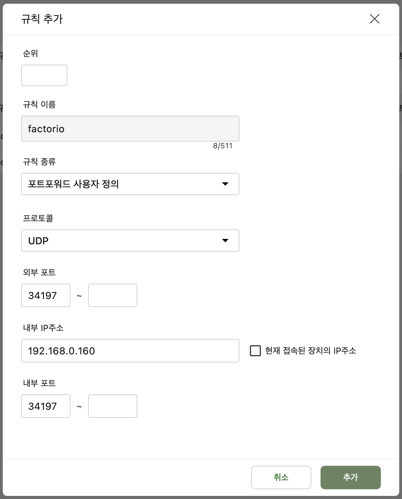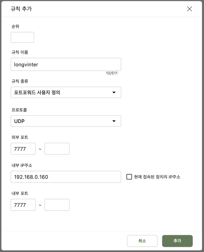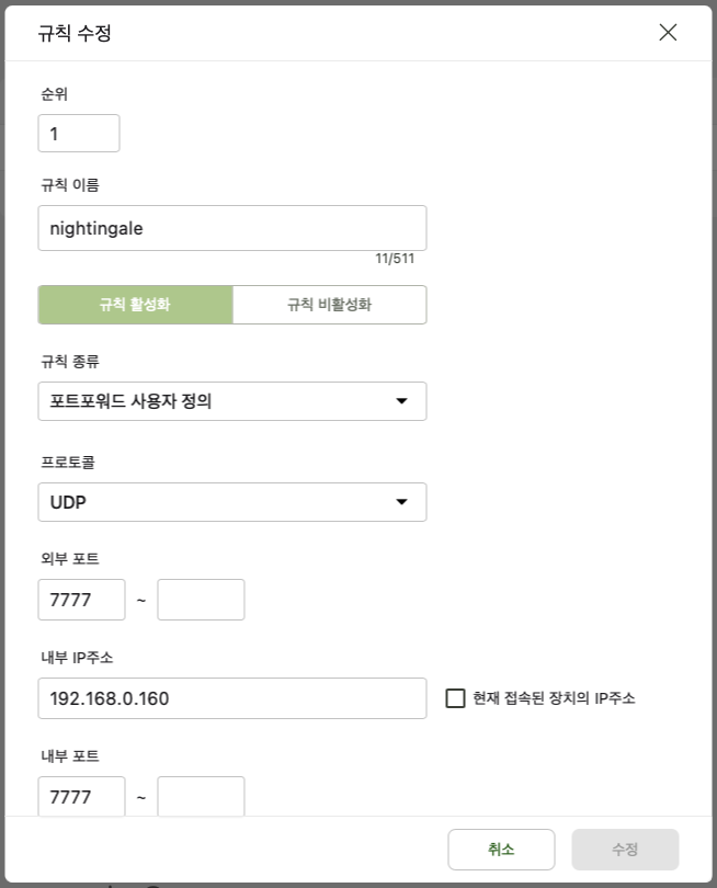 자신의 공유기에 접속하여 UDP 7777 번을 서버로 사용할 내부 PC IP로 연결합니다