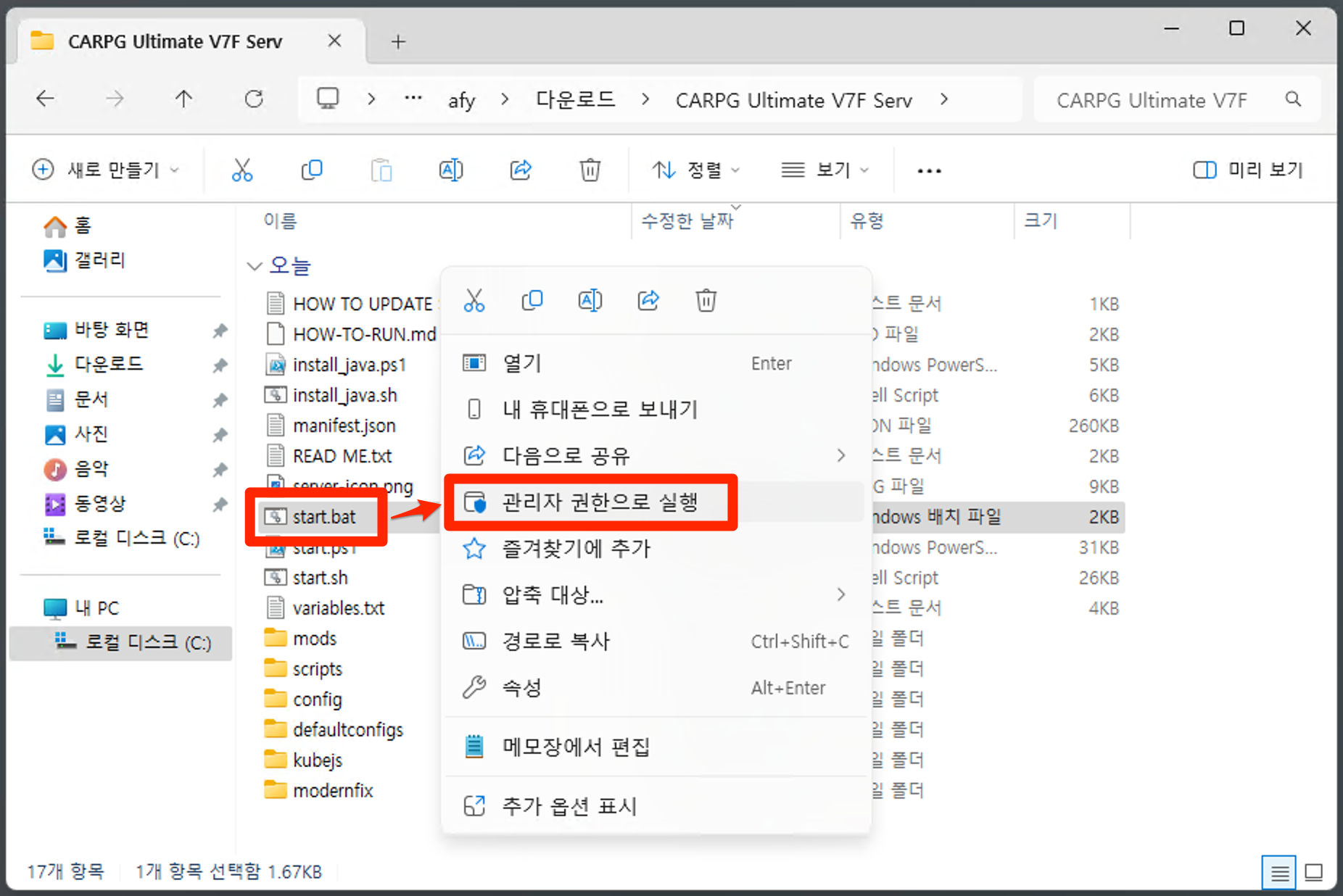 서버 시작 → start.bat 파일 실행 (관리자 권한)