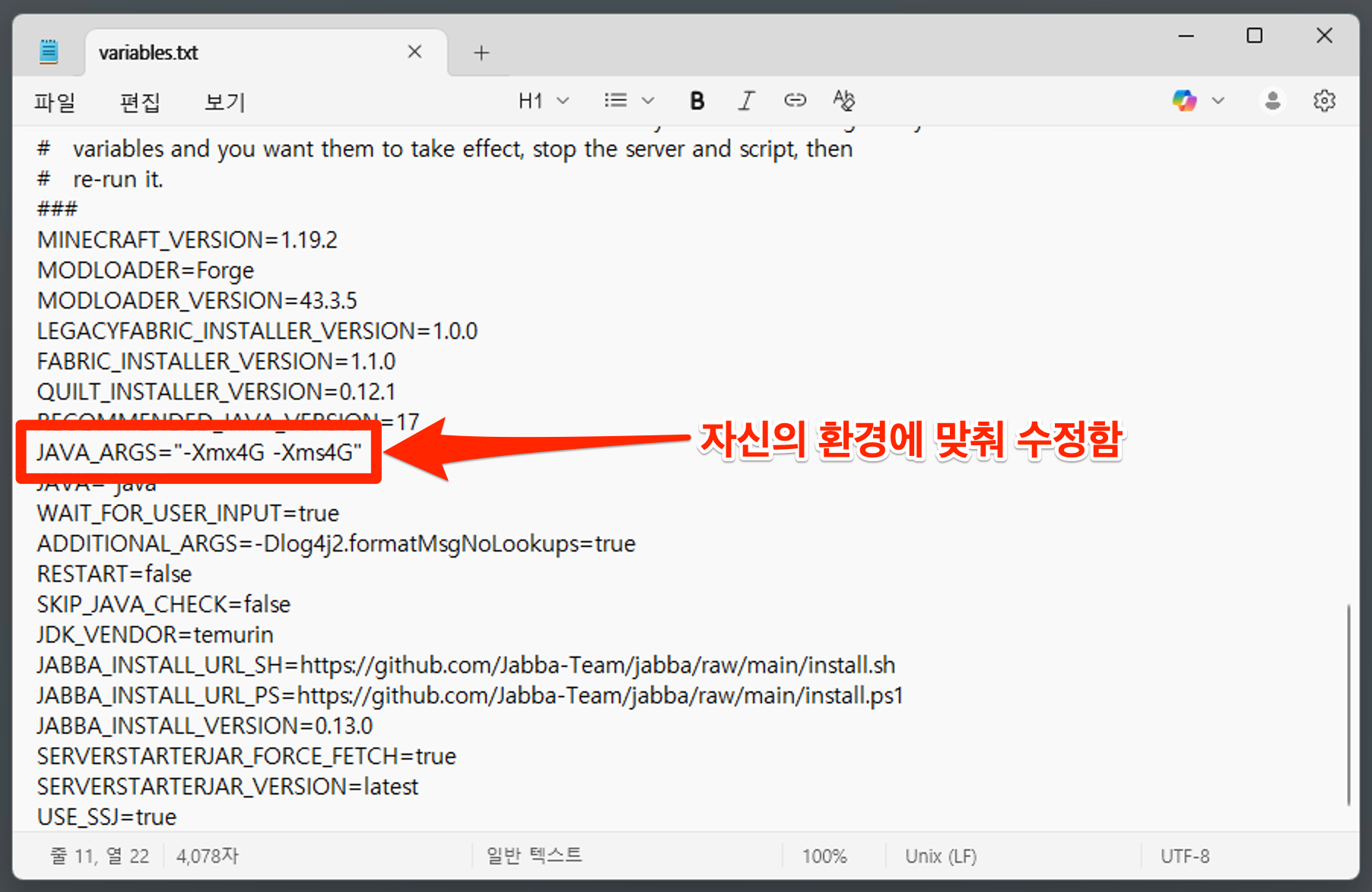 -Xmx, -Xms 부분을 자신의 윈도우 서버 환경에 맞춰 수정함