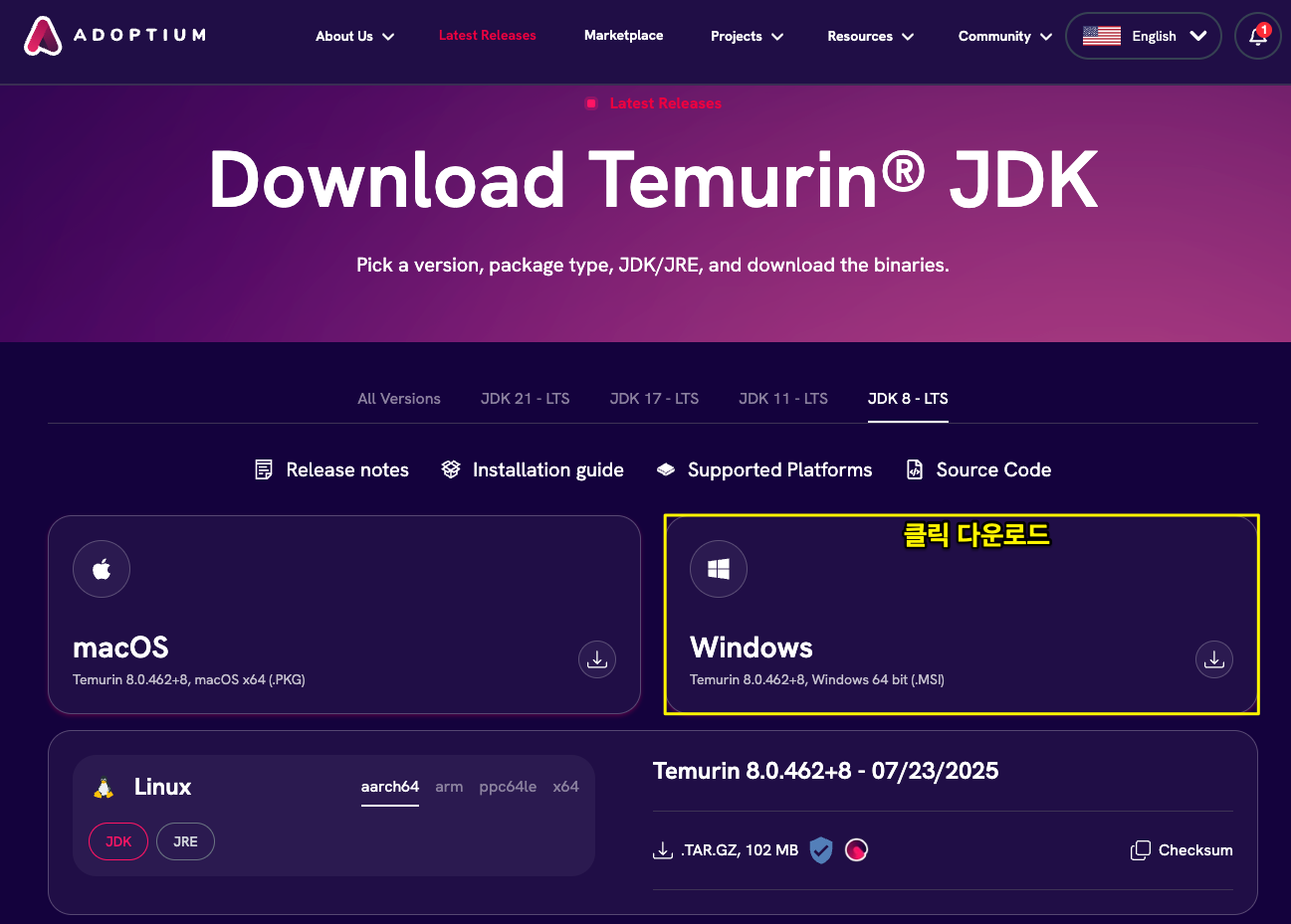 현재 RLCraft Mod Pack이 요구하는 자바 버전은 JDK8 입니다. 다운로드링크를 이용하여 설치를 진행합니다.
