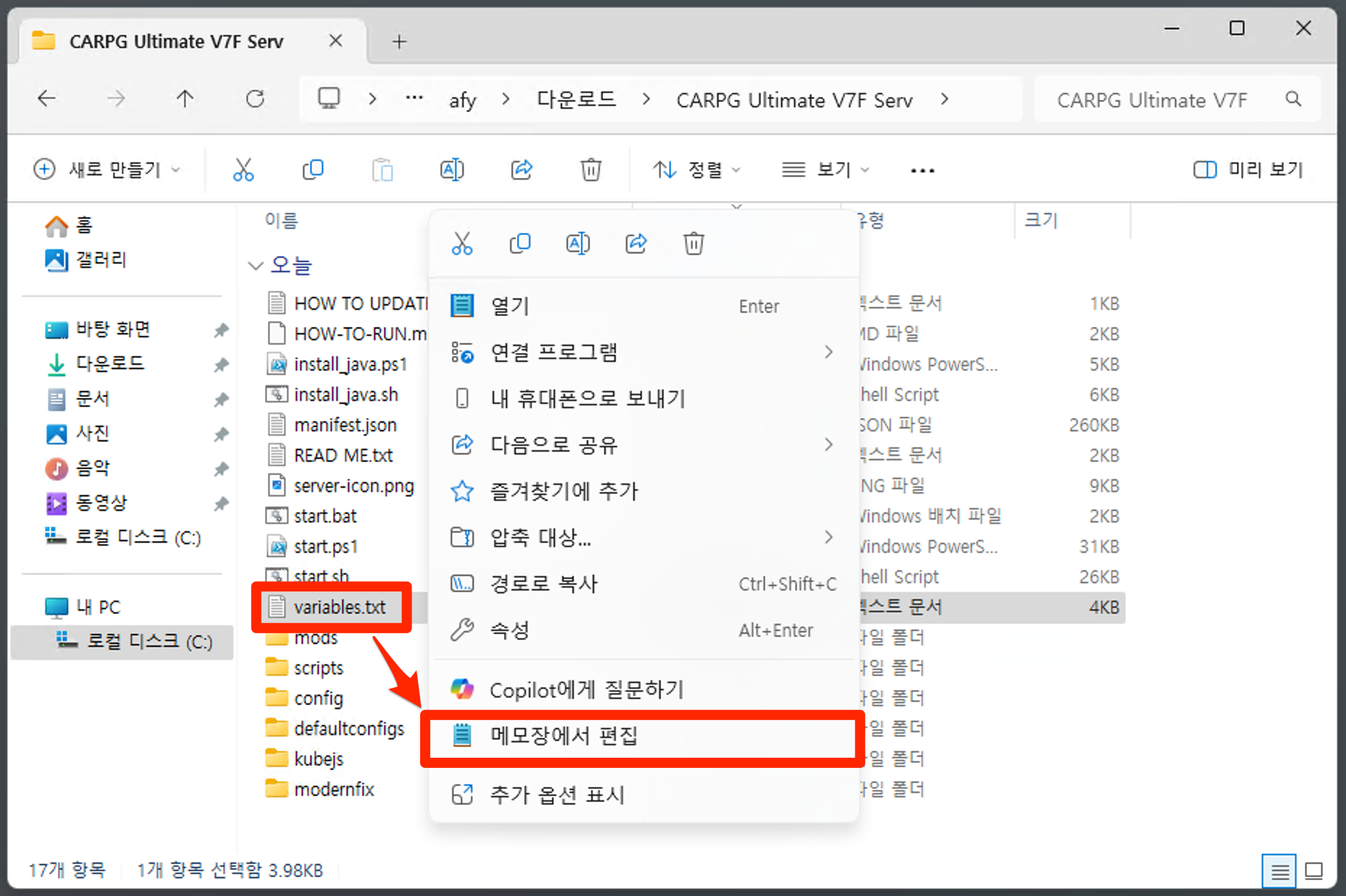 메모리 수정 : variables.txt