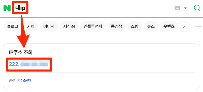 네이버 접속 후 → '내 IP'로 검색하여 결과 값을 확인하세요