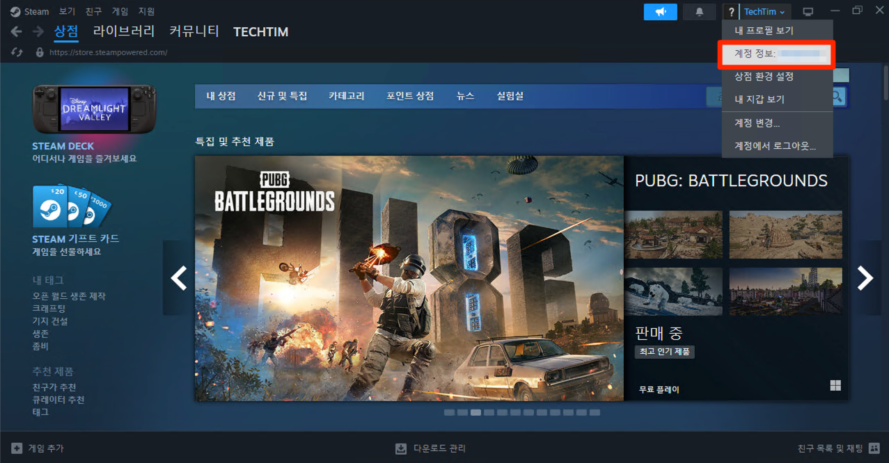 스팀 프로그램에서 자신의 '계정정보' 클릭