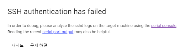Q: 구글 클라우드 SSH 접속 인증에 실패했다고 뜨면서 접속이 되지 않습니다.