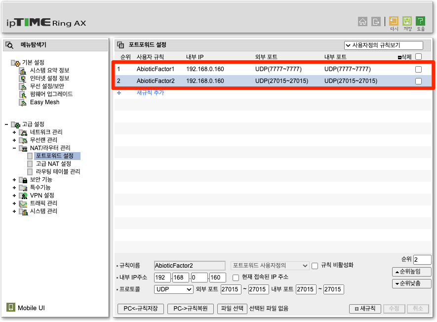 - 포트포워딩 메뉴로 진입 : IP타임 기준 'NAT/라우터 관리' → '포트포워드 설정'