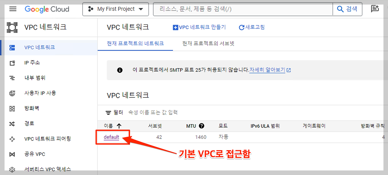 기본적으로 생성된 'default' 네트워크를 선택 합니다.