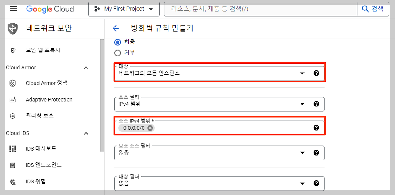 방화벽 이름을 설정합니다. 아무 이름이나 원하는 것으로 작성 합니다.