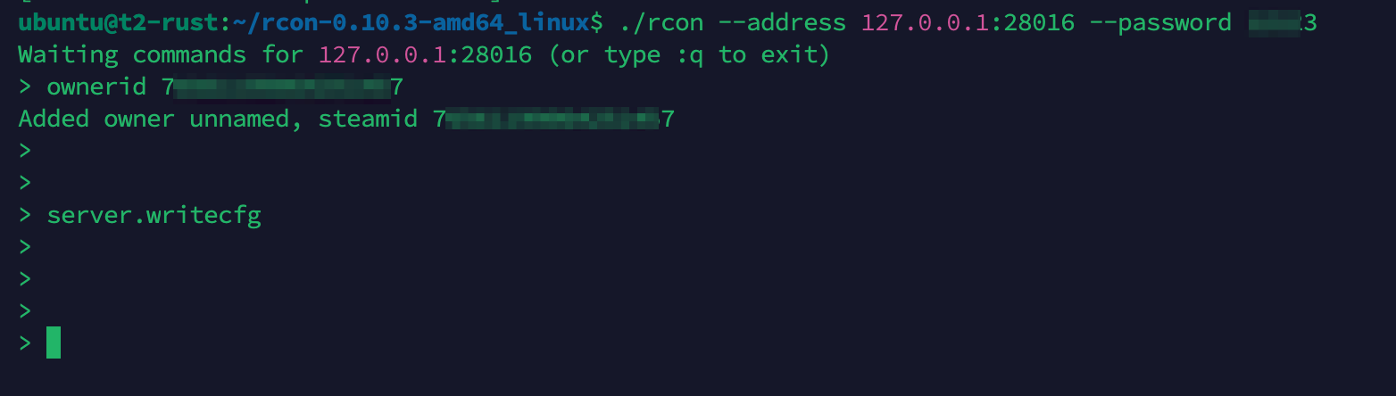 ./rcon --address 127.0.0.1:28016 --password <패스워드>