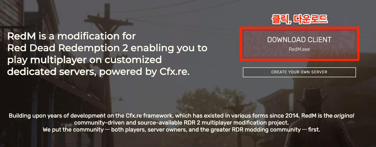 → RedM을 연결하기 위해서는 전용 클라이언트 프로그램이 따로 있습니다. 전용 클라이언트 프로그램을 다운로드하여 기존 Steam / Rockstar 클라이언트와 연결작업을 진행해야 합니다.