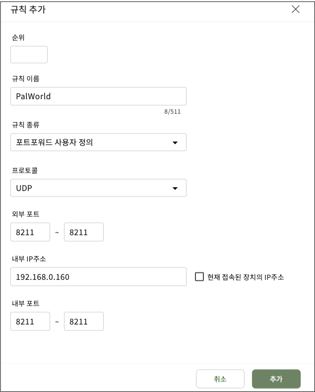 자신의 공유기에 접속하여 UDP 8211 번을 서버로 사용할 내부 PC IP로 연결합니다